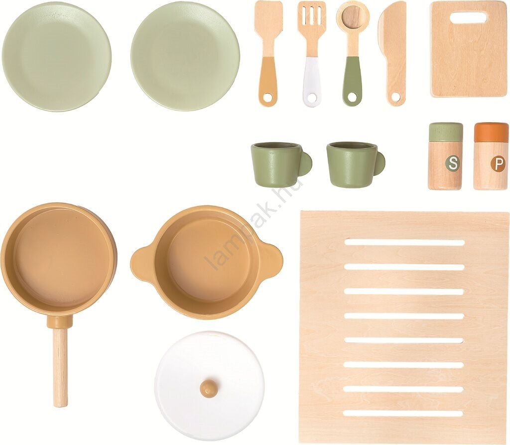 • A csomag tartalma: 2x tányér, 2x bögre, 1x serpenyő, 1x fazék, 1x fedő, 1x borsszóró, 1x sótartó, 1x vágódeszka, 4 db evőeszköz, sütőrács.