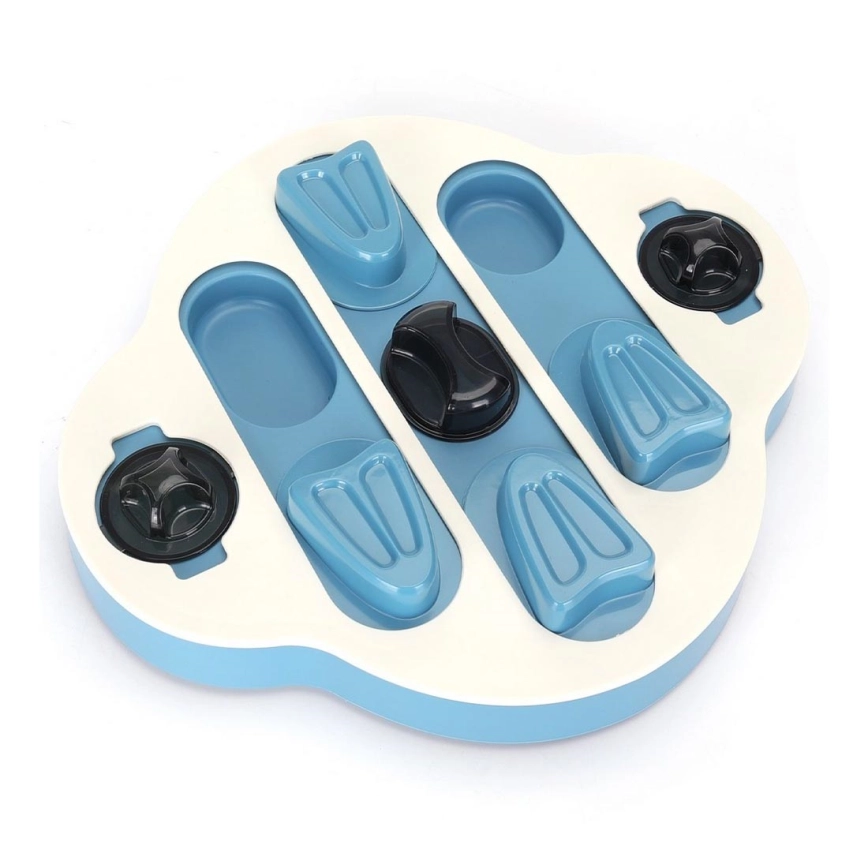 • A játék emelhető, forgatható és csúsztatható rekeszekkel rendelkezik, ahová kutyasüteményeket vagy jutalomfalatokat helyezhet a kutyája számára.