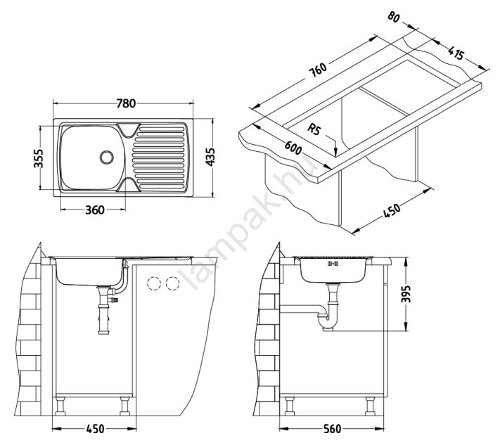 • A mosogató gyárilag lyuk nélkül érkezik; a csaptelephez külön kell kifúrni a nyílást.