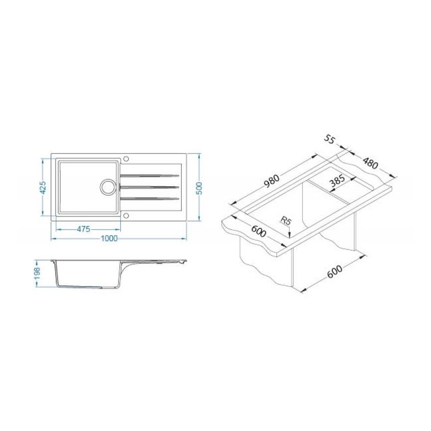 • A csomag tartalma: gránit mosogató, felső szereléshez rögzítők, 3 1/2-es szűrős leeresztő, mosogatógép bekötésére alkalmas szifon, excentrikus leeresztő vezérlés.