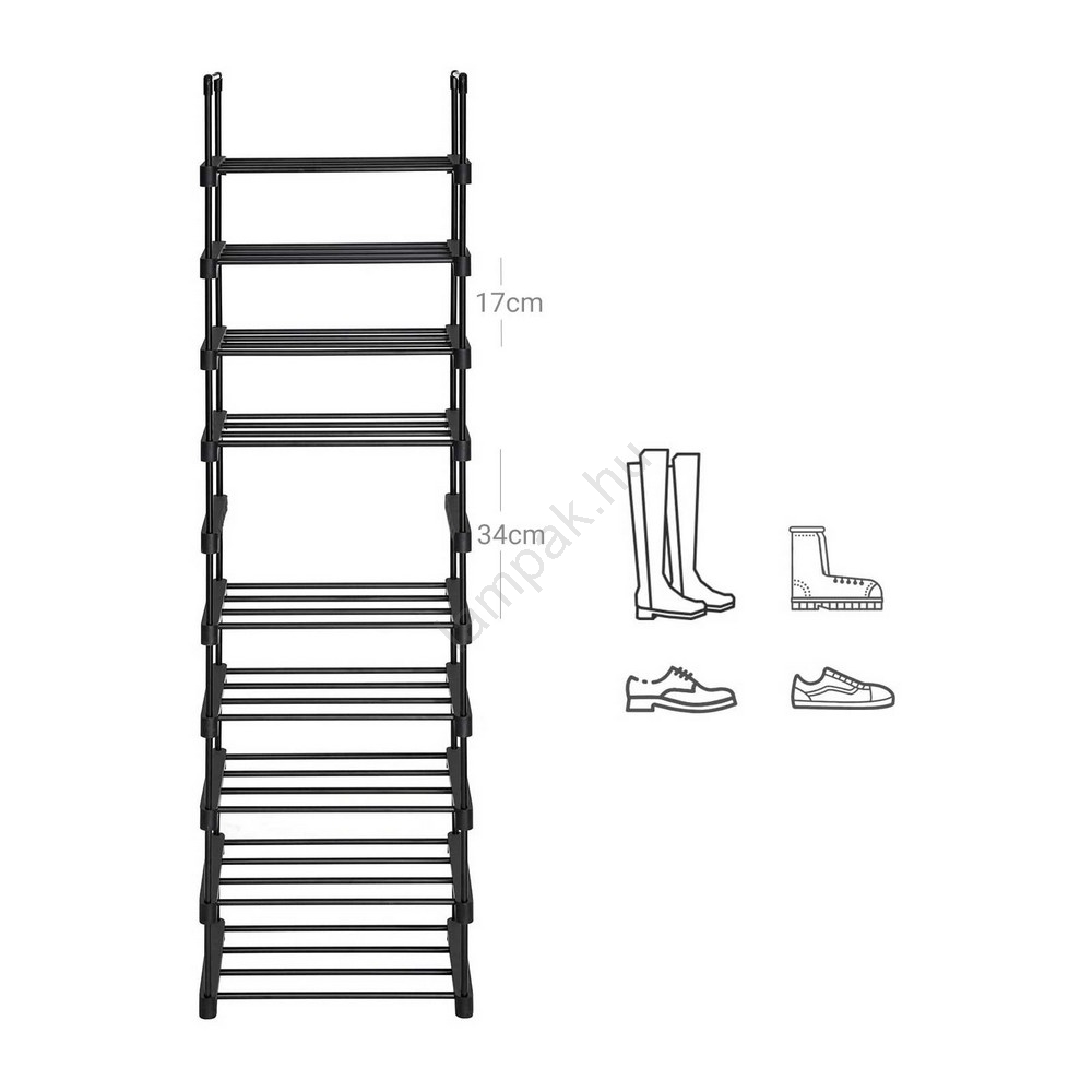 • Karcsú kialakításának köszönhetően ez a 10 polcos cipőtároló kevés helyet foglal a padlón, mégis elegendő tárolóhelyet biztosít 20 pár cipő számára.
