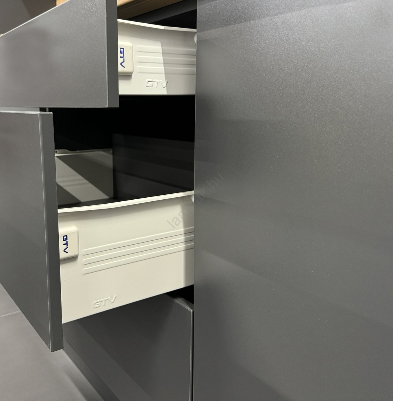 • Felső szekrények gázrugókkal vannak felszerelve, a fiókokban pedig beépített minőségi zárt fémfutók.