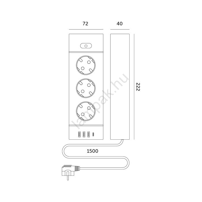 • Aljzatok száma: 3 x 230V, 3x USB-A és 1 x USB-C.