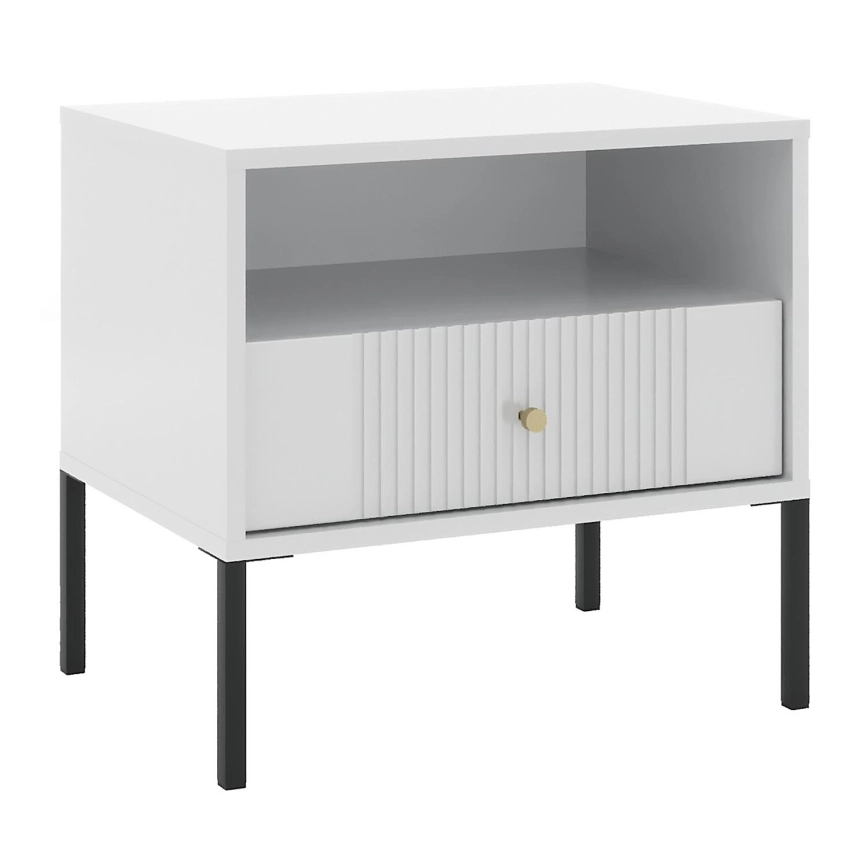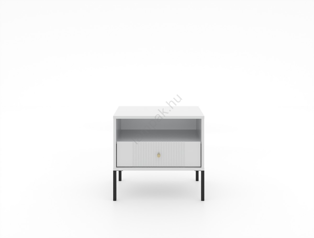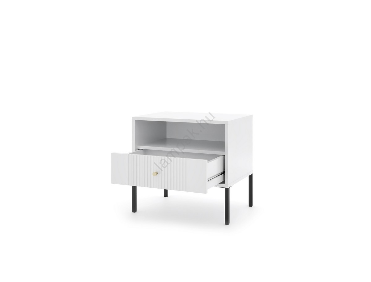 • Egy nyitott polccal és egy, függőleges bordázattal díszített fiókkal rendelkezik, amely kifinomult vizuális hatást teremt.
