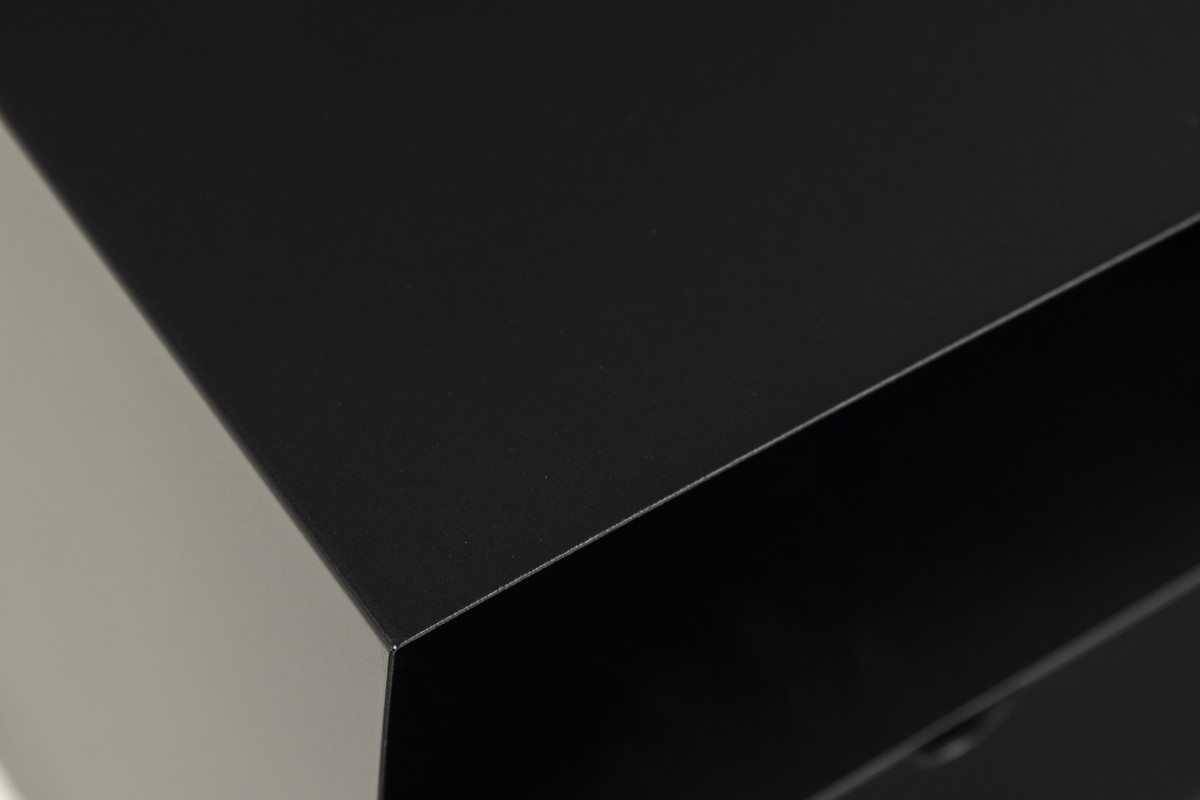 • A tetőlap és a váz matt fekete, durva felületű porfestett acél; a fiók fekete, nyitott rekesszel és fali rögzítéssel.