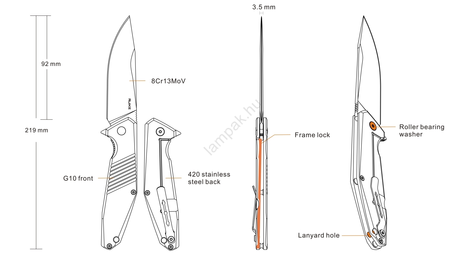 • A markolat rozsdamentes acél és G10 kompozit kombinációjából készül a tökéletes fogásért.