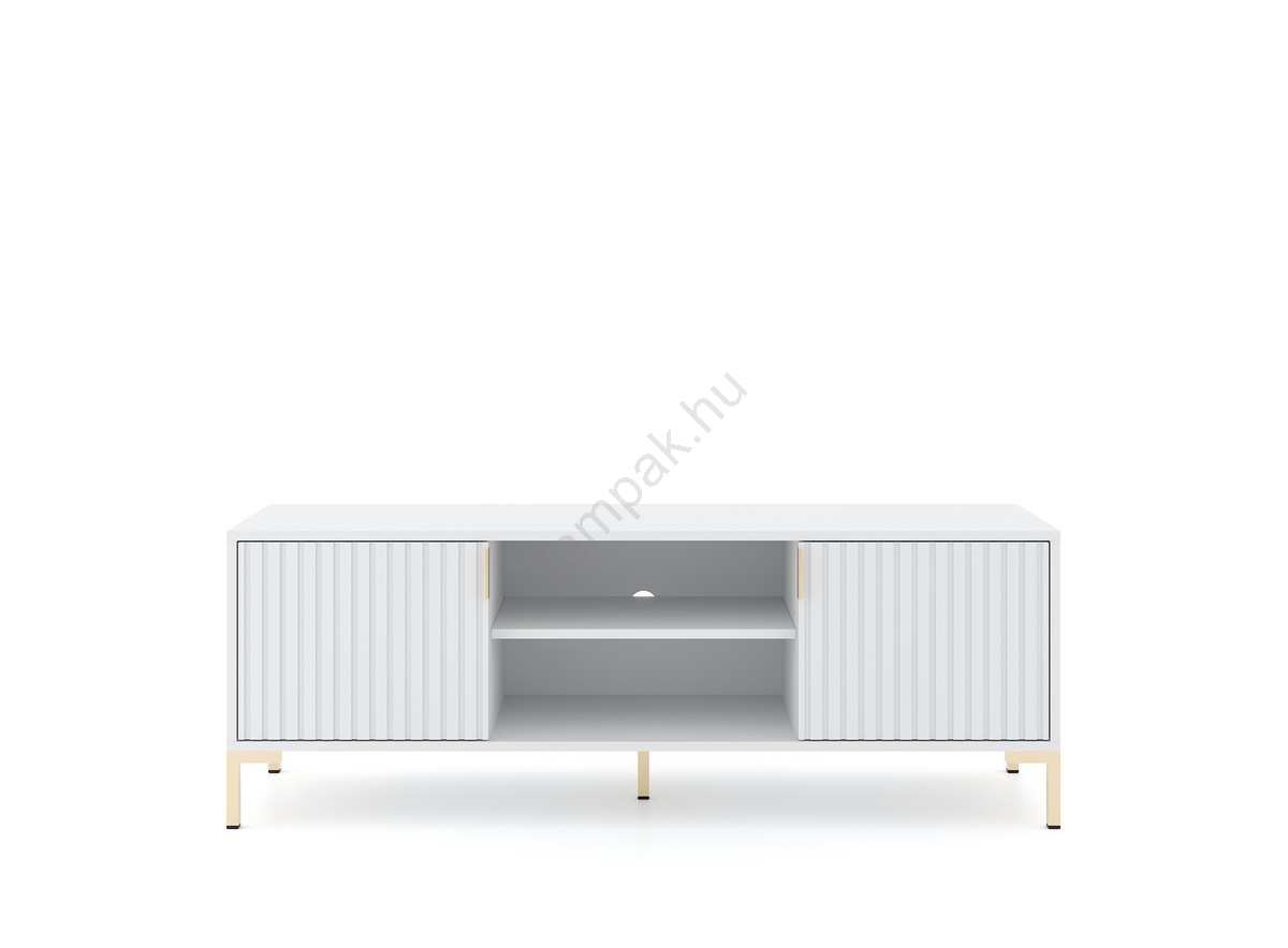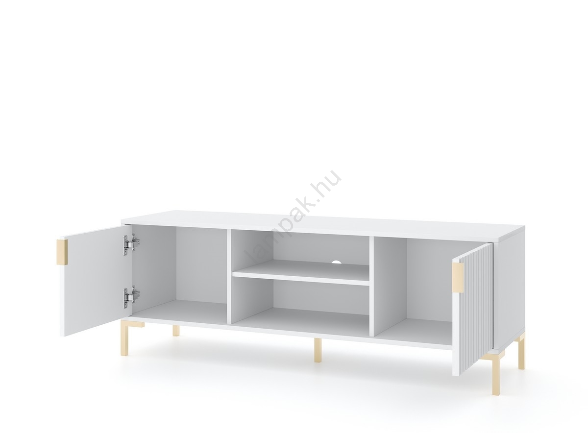 • Két zárt oldalsó rekesszel rendelkezik, mindegyik ajtóval, szimmetrikus fogantyúkkal és bordázattal, valamint két nyitott polccal középen, kábelkivezető nyílással.