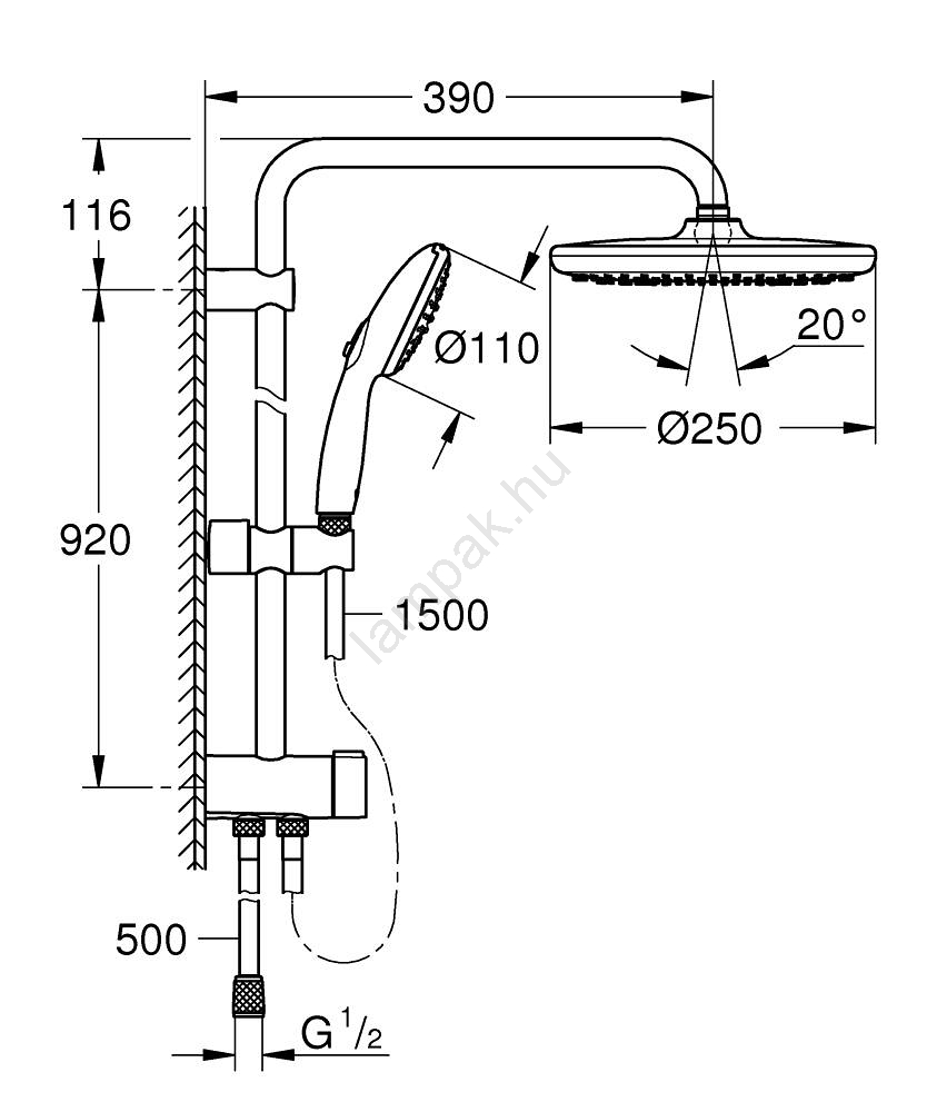 • Vízszintes zuhanykar 390 mm hosszban, telepítés előtt állítható az optimális elhelyezés érdekében.