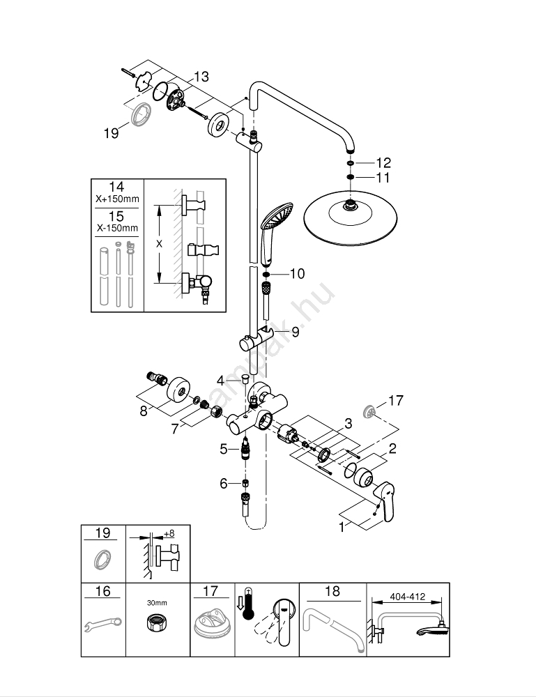 • 450 mm hosszú, vízszintesen forgatható zuhanykar a fejzuhany rugalmas pozícionálásához.