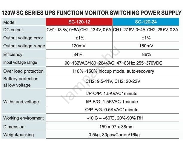 • Kimenet: 12V±10% (trimmerrel szabályozható) 120W /8A 12V-on, 13,4V/0,5A az akkumulátor töltéséhez.