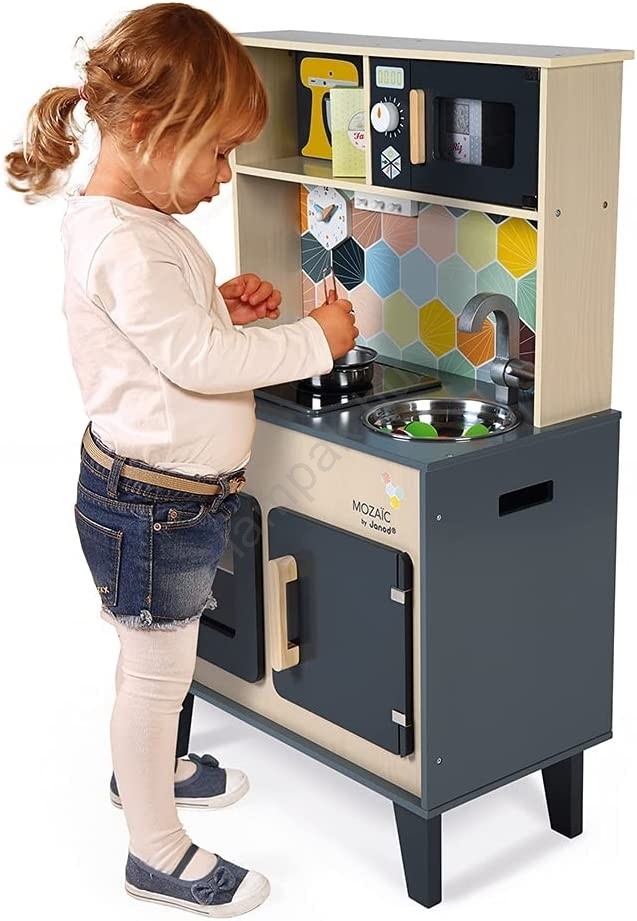 • A nagy Mozaic konyha fából készült, és egy kampóval rendelkezik, amelyre 1 merőkanalat, 1 fazekat és 1 fém szűrőt lehet akasztani, valamint 3 kartondoboz tárolja az élelmiszereket (sajt, liszt, rizs).