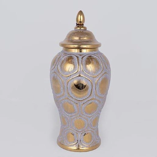 • A arany szín kiemeli a minta kontúrjait és a fedelet, luxus és kifinomult megjelenést kölcsönözve a vázának.