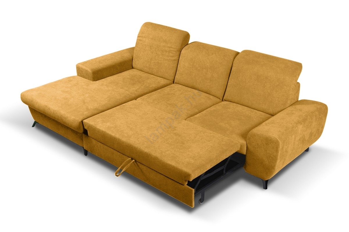 • ALTA L-alakú balos ágyazható kárpitozott sarokkanapé tárolórekesszel, sárga