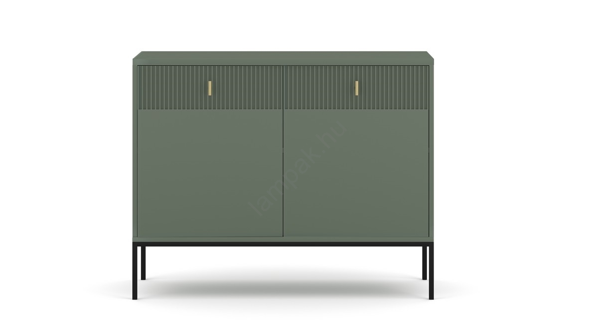 • Két alsó ajtó nagy tárolóhellyel, valamint két, fogantyúval és függőleges bordázattal díszített fiók.