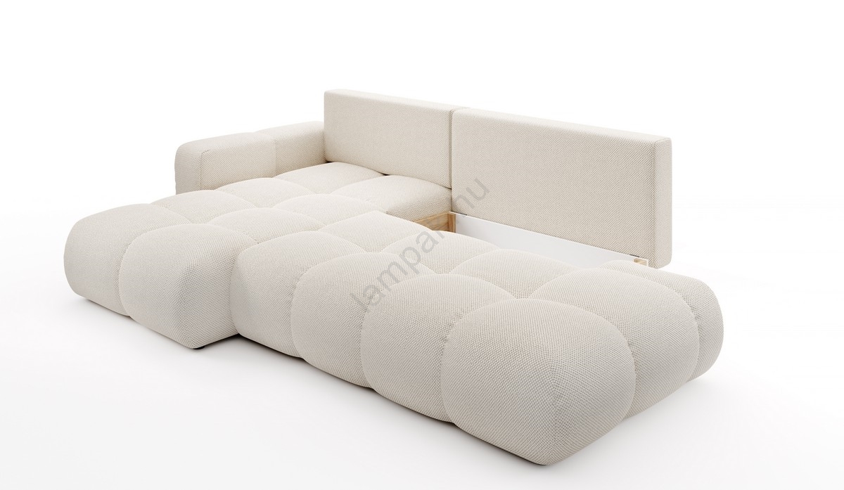 • ALMADA L-alakú, balos, ággyá nyitható kárpitozott ülőgarnitúra tárolórekesszel, világos bézs