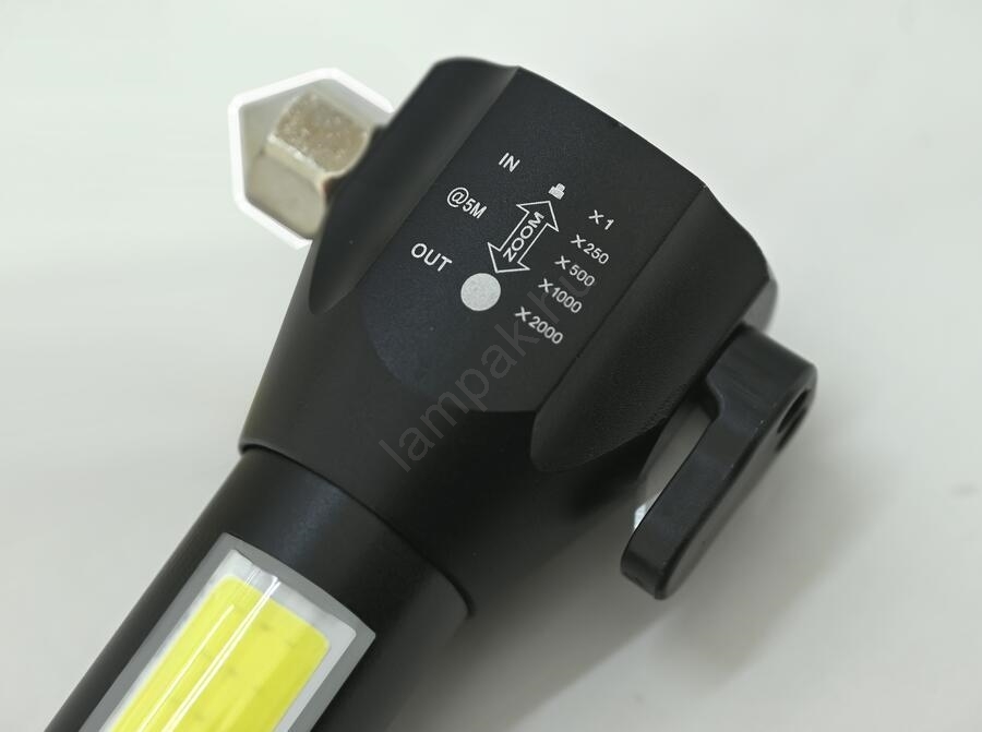 • A lámpa további felszerelései közé tartozik a szíjvágó és a vészhelyzeti üvegtörő hegy a lámpa tetején.