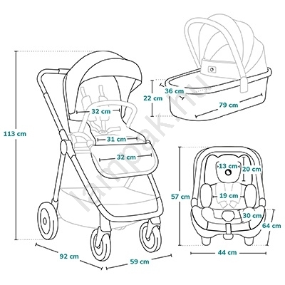 • Tartozékcsomag: lábzsák, szúnyogháló, mózeskosár-huzat, esővédő, táska, pohártartó, zárható kosár.