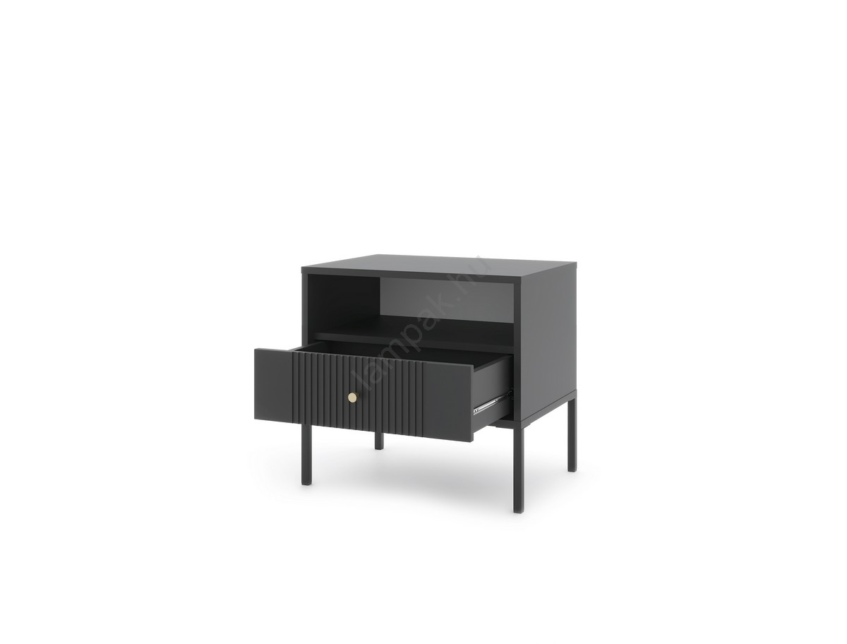 • Egy nyitott polccal és egy függőleges bordázattal díszített fiókkal rendelkezik, amely kifinomult vizuális hatást kelt.