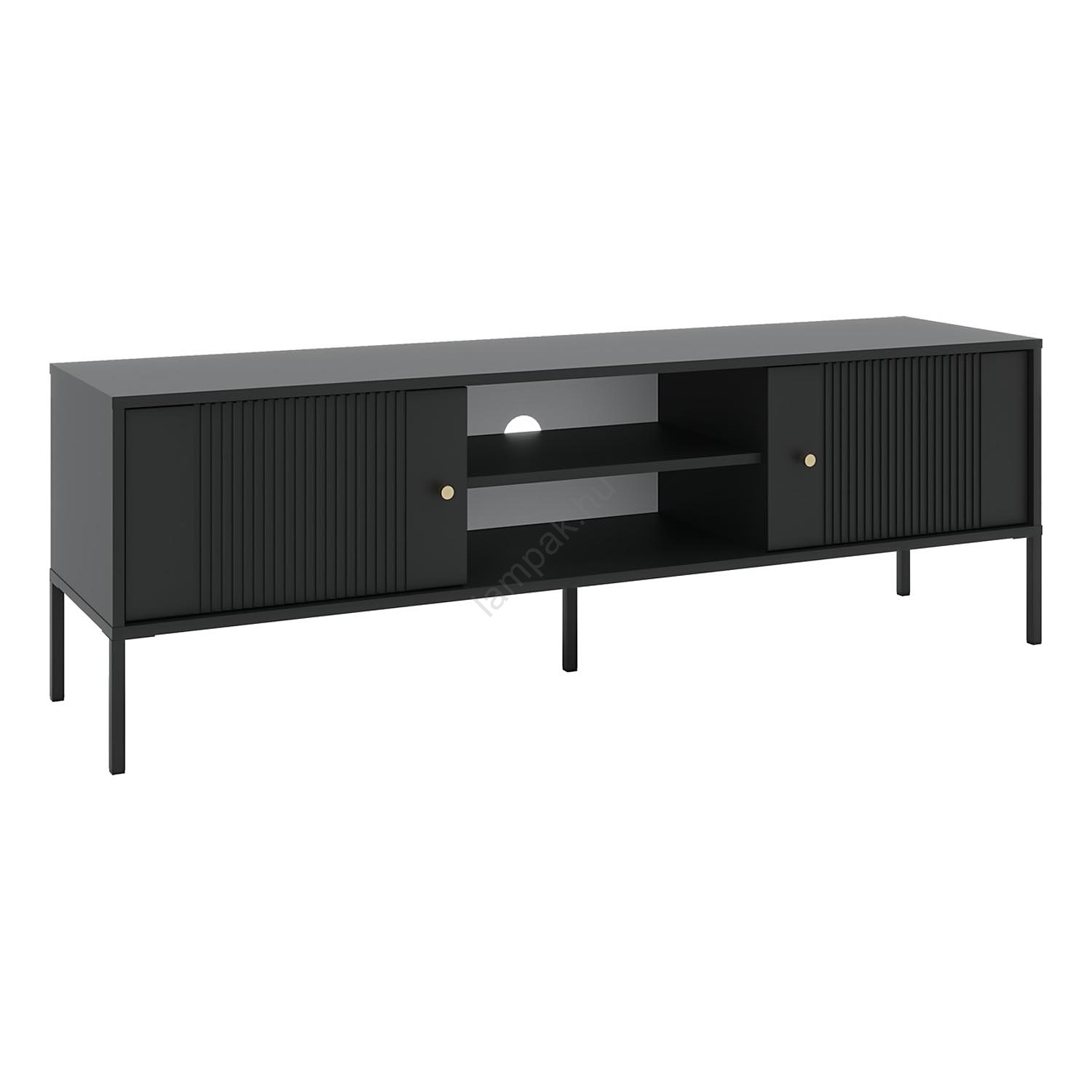 • Két zárt, bordázott oldalsó rekesszel és két nyitott polccal rendelkezik, középen kábelkivezető nyílással.
