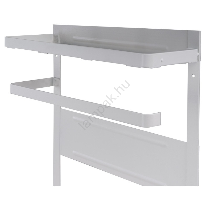 • A polc minőségi fém szerkezetből áll, erős mágnesekkel és csavarozási lehetőséggel a falhoz rögzítéshez, két könnyen levehető fa rúddal, amelyekre textil törlőkendőket vagy 28 cm hosszú élelmiszerfóliát, alufóliát lehet akasztani.