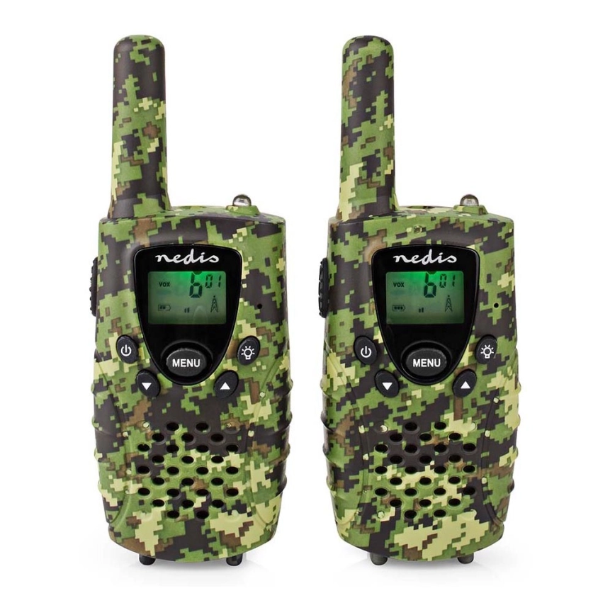 KÉSZLET 2x Walkie-talkie LED fénnyel 3xAAA hatótáv 8 km terepszínű