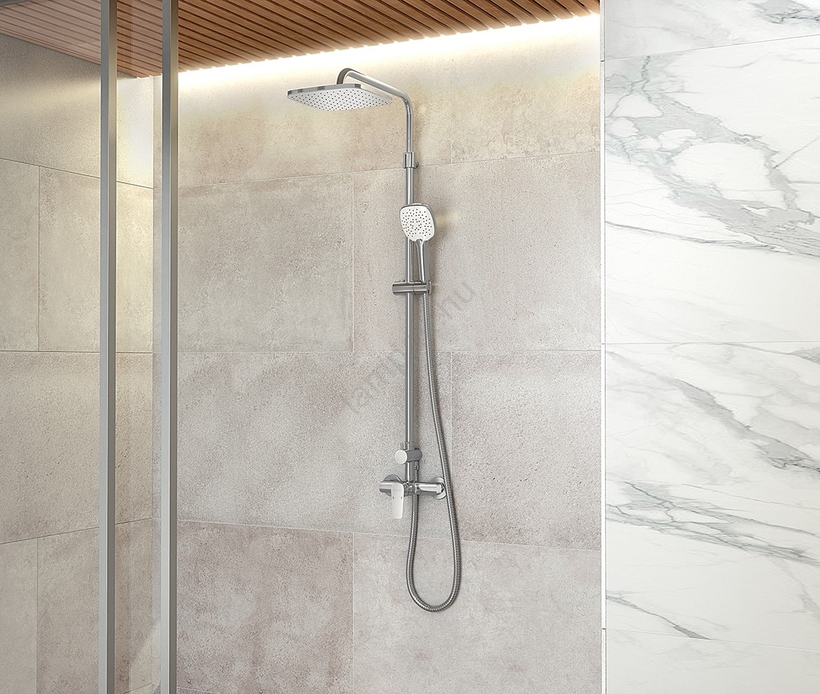 • A csomag tartalma: zuhanycsaptelep kazettával, 3 fokozatú kézi zuhany, állítható csúszka kézi zuhanytartóval, fém zuhanytömlő, fejzuhany.