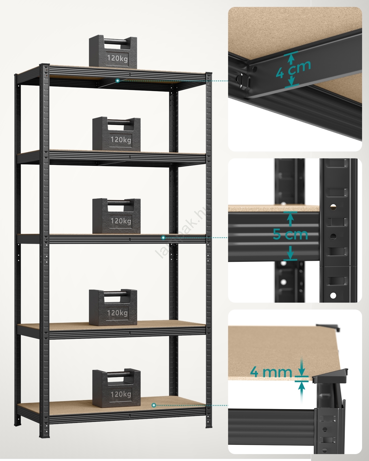 • Minden polc akár 120 kg terhelést is elbír, így biztonságosan tárolhat festékeket, szerszámokat és fitneszfelszerelést.