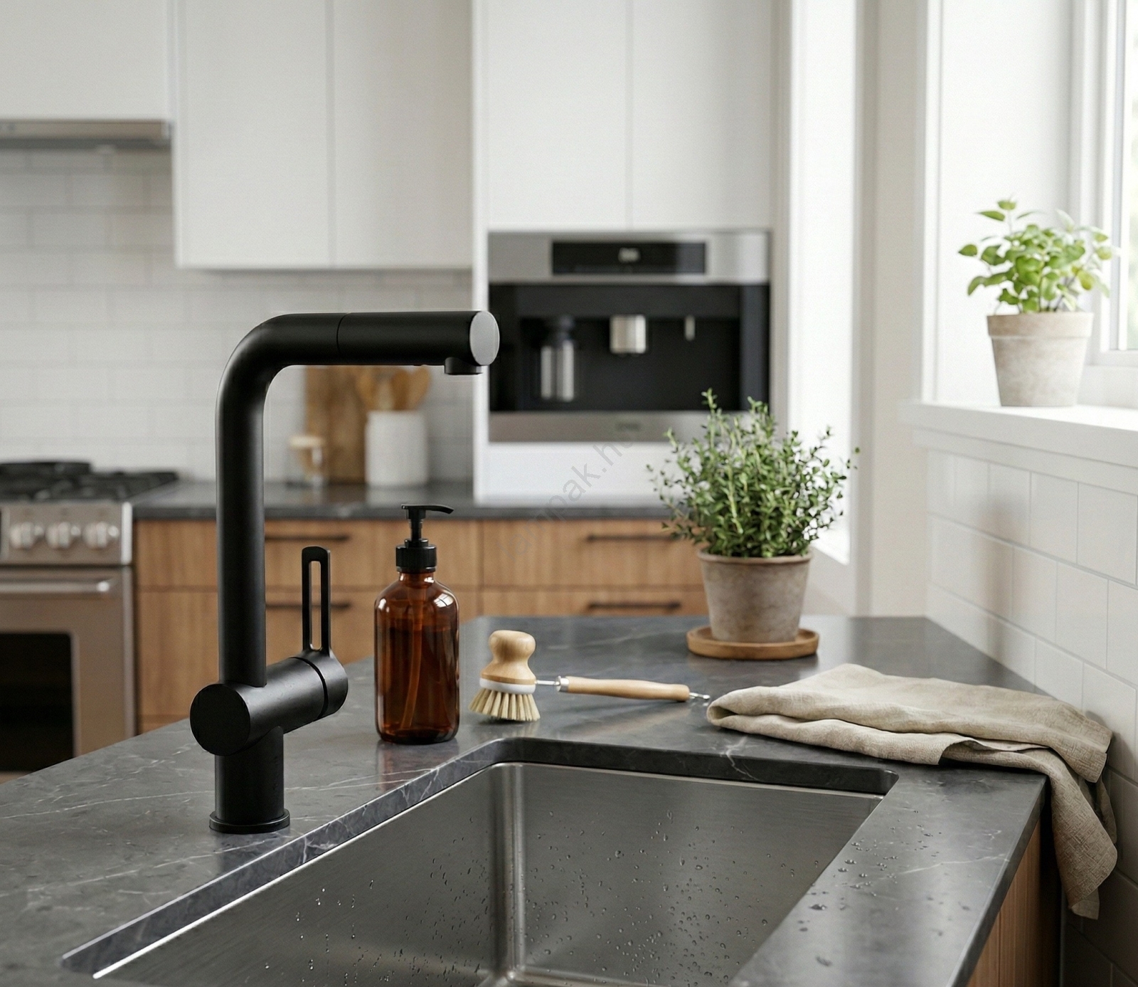 • Modern konyhai mosogatócsaptelep elegáns, matt fekete kivitelben.