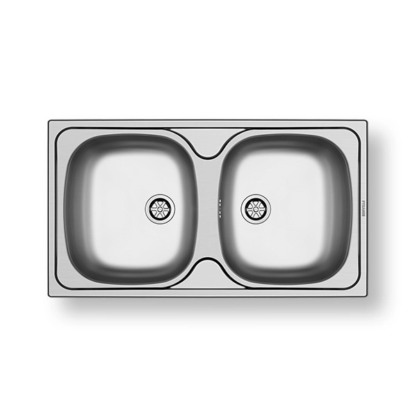 • Kétmedencés rozsdamentes mosogató, csaplyuk nélkül.