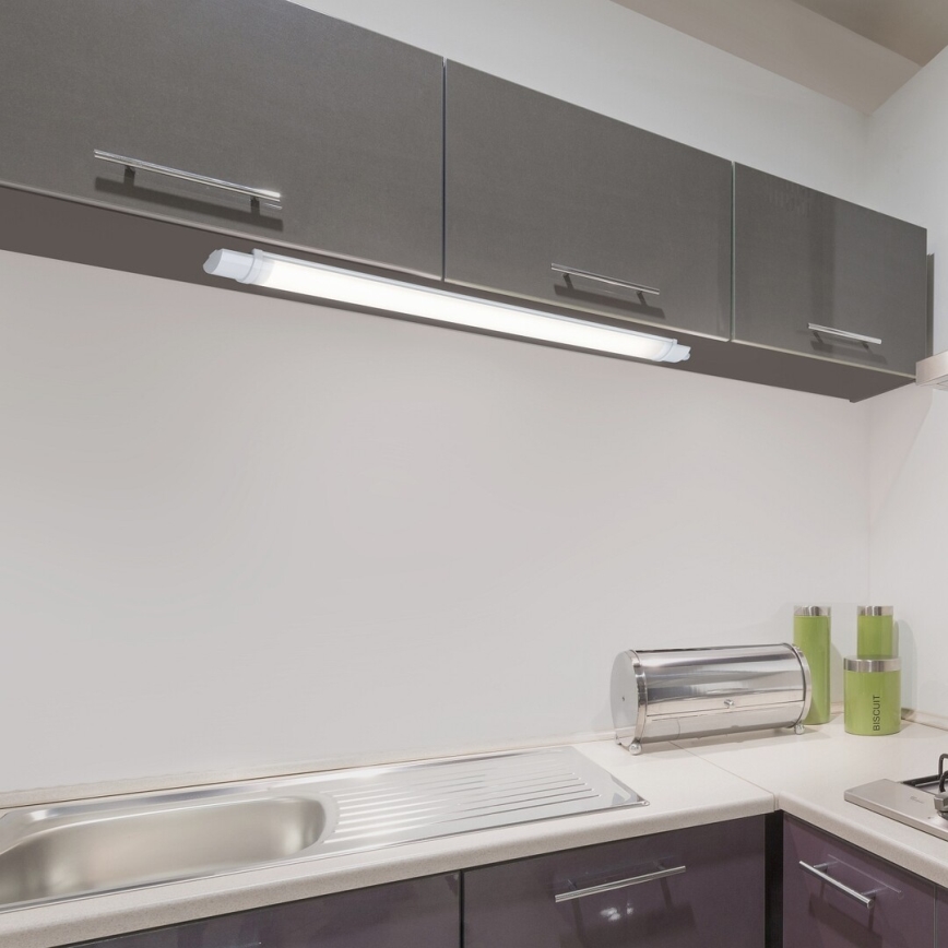 A Drop Light használható a konyhában, a pult vagy a mosogató felett, vagy a fürdőszobában, a tükör fölé szerelve. Javasoljuk, hogy nedves helyiségekben is használjuk, mivel IP65-ös minősítése biztosítja, hogy teljesen zárt és védett legyen a szilárd anyagokkal és szennyeződésekkel, valamint az alacsony nyomású vízzel szemben. Ez a fehér, műanyag lámpa funkcionális stílusú, ezért minden otthon praktikus kiegészítője. Méretei a következők: hossza 600 mm, magassága 52 mm, a faltól való távolsága 28 mm. A beépített, energiatakarékos LED-es fényforrás 4000 K színhőmérsékletű, ennek megfelelően természetes fehér fényt bocsát ki. A fényforrás energiafogyasztása 20 W, fényereje 1600 lumen, élettartama pedig körülbelül 20 000 óra. A Drop Light lámpára 5 év garanciát adunk.