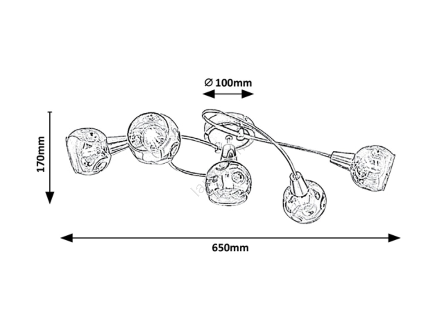 Tamara spotlámpa 5 izzóval, modern stílusban, gyönyörű és elegáns kiegészítője lesz nappalija vagy hálószobája berendezésének. A króm színű fém lámpatest tónusos üveg búrákkal van kiegészítve. A lámpa mennyezetre szerelhető egy kerek díszítő talp segítségével. A krómozott dekoratív talp fekete elülső panellel van borítva, és az öt lámpafej különböző irányokba nézve világítja be a Tamara lámpa fényével a szoba minden részét. A fény titokzatosan szűrődik át a tónusos, lekerekített búrák üvegén, amelyek alul nyitottak. A Tamara lámpa öt izzóval használható, egyenként legfeljebb 40W teljesítménnyel. A foglalat típusa E14. Ha szeretné fokozni a helyiség intim és otthonos hangulatát, válasszon ehhez a lámpához meleg fehér fényforrásokat. A Tamara spotlámpa 5 izzóval méretei a következők: szélesség 650 mm, mennyezettől való távolság 170 mm, szerelési átmérő 100 mm. Ez a modell fényforrások nélkül kerül forgalomba.