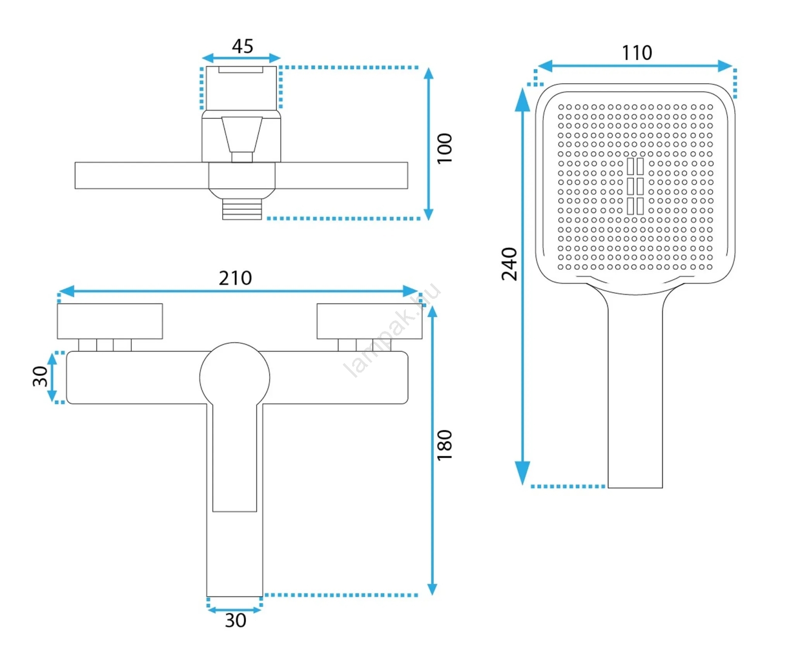 • A készlet tartalmazza: kádcsaptelep, kézi zuhany, zuhanytömlő, kézi zuhanytartó.