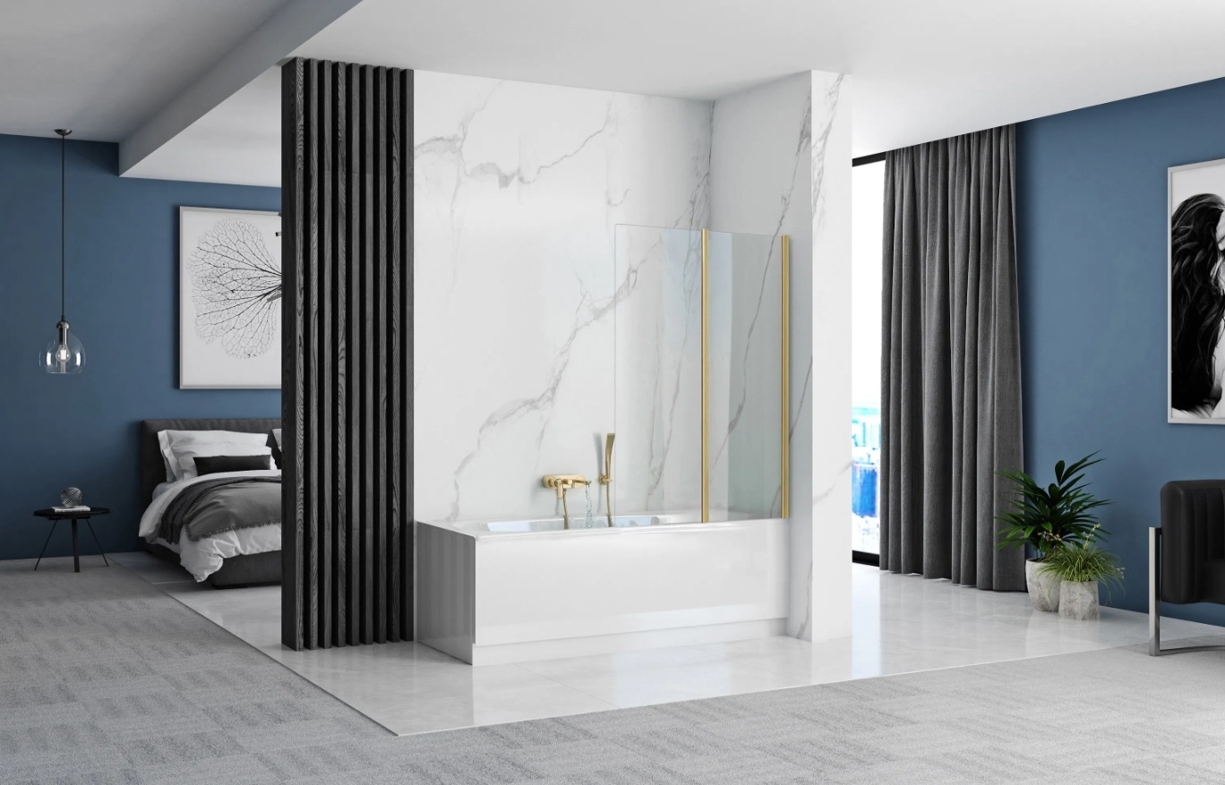 REA-K9777 - Összecsukható kádparaván AGAT 140x100 cm szálcsiszolt arany/átlátszó