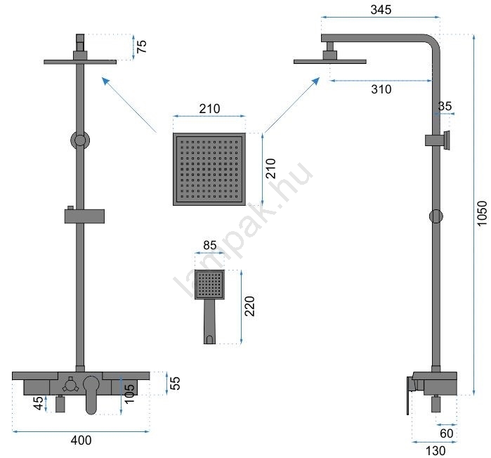 • A csomag tartalmazza: kézi- és fejzuhany, kézi zuhanytartó, polc, kifolyócső, csaptelep kerámia kazettával és 150 cm-es tömlő.