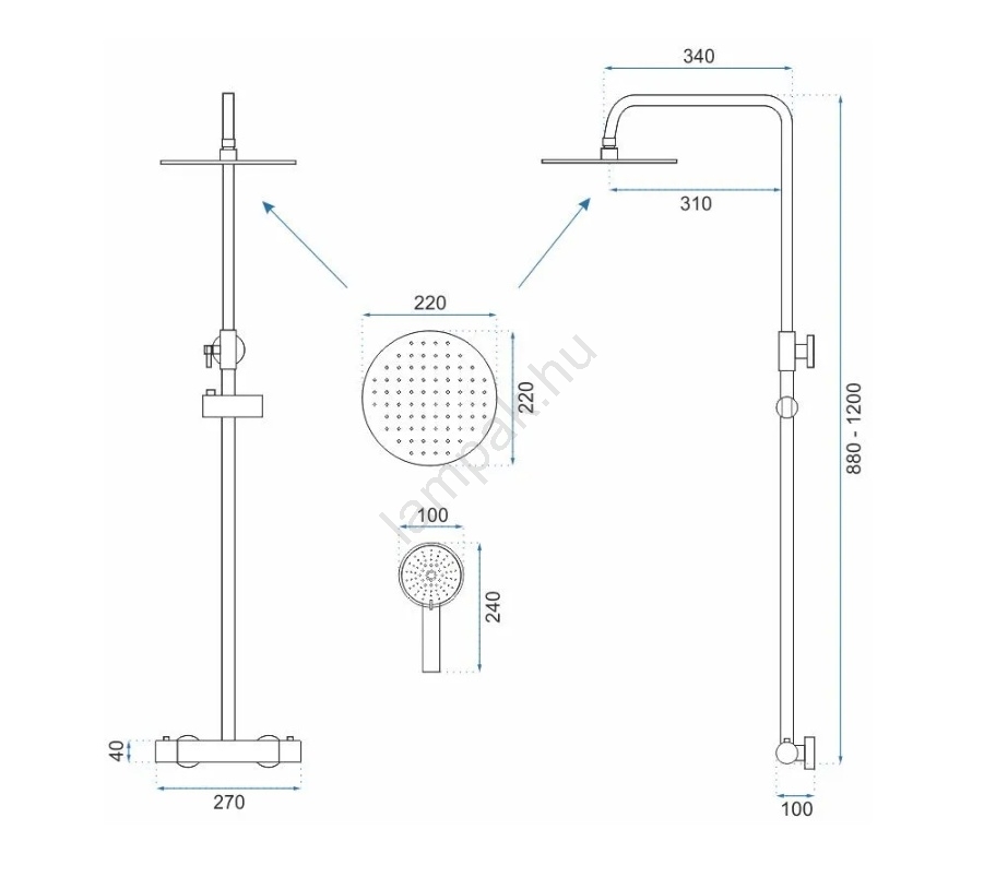 • A csomag tartalmazza: termosztátos csaptelepet, kézi és fejzuhanyt, tartót, 150 cm-es tömlőt.