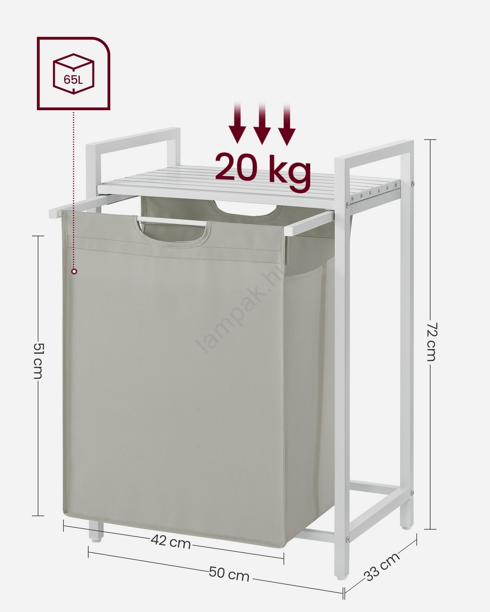 • 1 zsák, 1 polc – Helyezze ruháit a textilzsákba (65 l) a tegye a mosószert, öblítőt és egyéb kiegészítőket a fölötte lévő polcra.