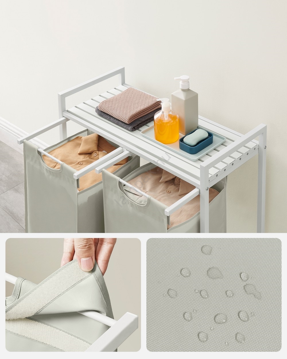 • 2 textilzsák, 1 polc – Rendezze szét ruháit két textilzsákba (46 l zsákonként) és helyezze a mosószer, öblítő és egyéb kiegészítők számára szolgáló polcra.