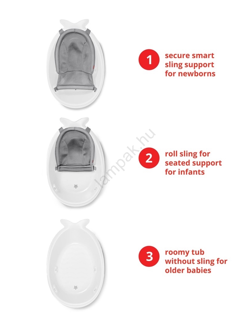 • A fürdőkád a gyermek növekedésével együtt fejlődik, 3 állítható pozícióval.