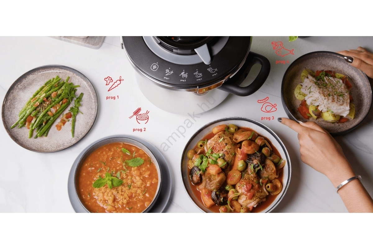• A nyomásfőző négy előre beállított programmal rendelkezik (zöldség, gabonafélék/hüvelyesek, hús, hal), amelyek megkönnyítik a különböző ételek elkészítését.