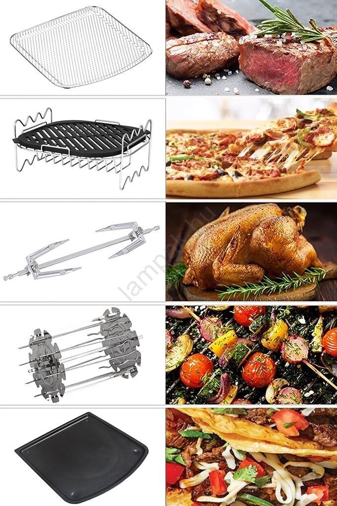 • A csomag tartalma: multifunkcionális digitális forrólevegős fritőz, multifunkcionális tartó grillező lappal (ideális különféle húsok vagy pizza elkészítéséhez), 3 grillező nyárs (hosszúság 23,5 cm), 10 nyárs tű tartóval spízekhez vagy nyársakhoz, 3 drótrács, csepegtetőtálca, grillező villa, levehető tartó.