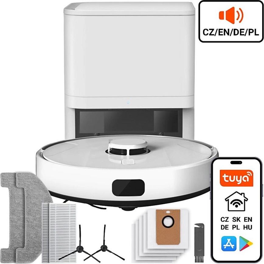 • A csomag tartalma: lézeres robotporszívó automatikus szennyeződésürítéssel, 2 az 1-ben tartály szennyeződésre és vízre, töltőállomás automatikus szennyeződésürítési funkcióval, szennyeződésgyűjtő zsákok a töltőállomáshoz (5 db), oldalsó tisztító kefe (2 db), vízzel mosható HEPA H13 szűrő (2 db), mikroszálas felmosó kendő (2 db), mop tartó, tisztító kefe pengével.