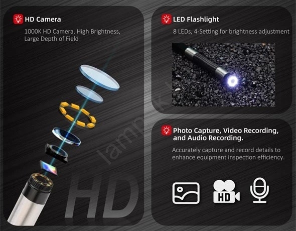 • A szonda végén található 8 mm átmérőjű objektív nyolc, négy fokozatban állítható LED-del rendelkezik, amelyek ideális megvilágítást biztosítanak a vizsgált területnek.