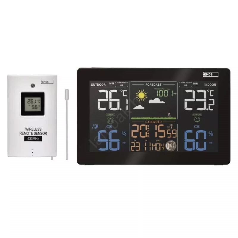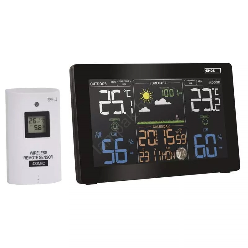 • Megjeleníti az információkat: beltéri és kültéri hőmérséklet, beltéri és kültéri páratartalom, maximális és minimális hőmérsékleti érték, időjárás-előrejelzés, idő, dátum és naptár.