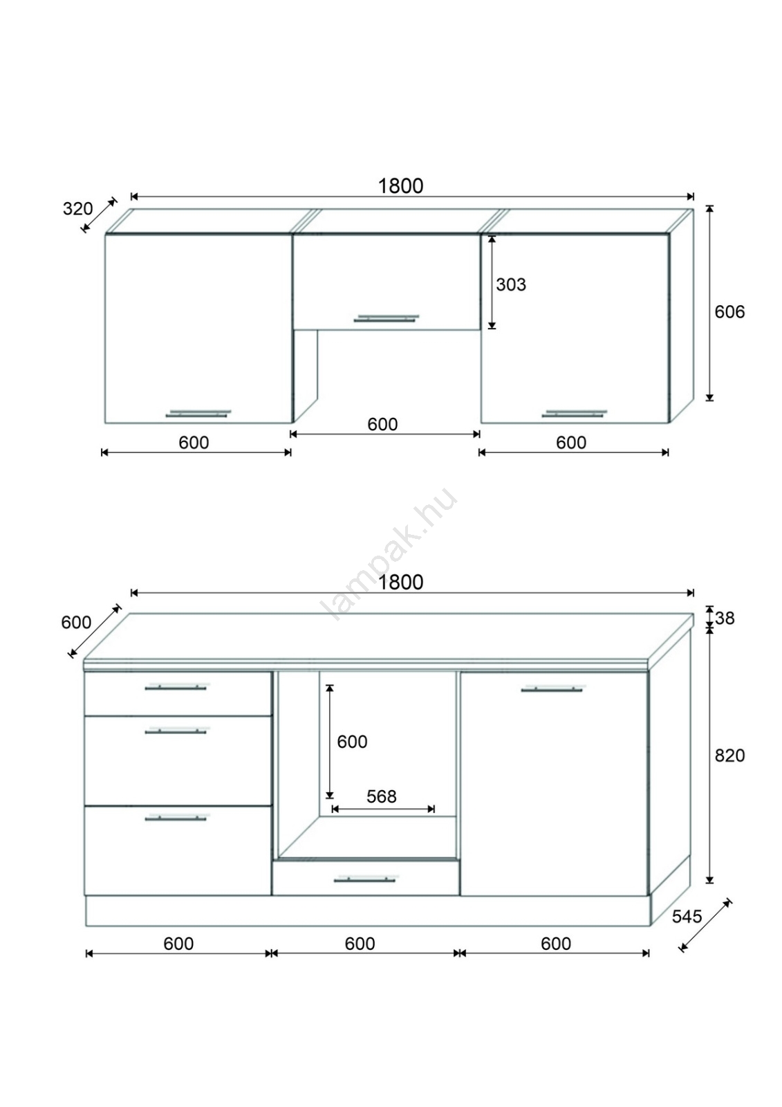 • A praktikus konyhabútor tágas, jól tagolt tárolóhelyet és egyrészes munkalapot biztosít.