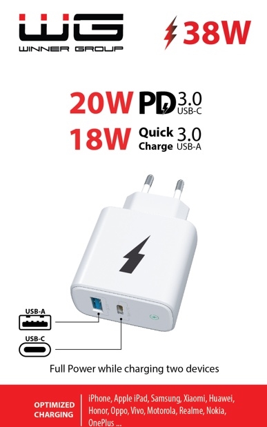 Winner Group - Gyorstöltő adapter 1xUSB-C + 1xUSB-A Power Delivery 38W fehér